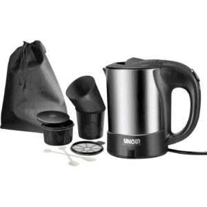 Der Unold Reise-Wasserkocher ist der ideale Begleiter für unterwegs und sorgt überall schnell für heißes Wasser. Dank seiner kompakten Größe und dem robusten Edelstahlgehäuse eignet er sich perfekt für Reisen, Camping oder das Hotelzimmer. Mit praktischen Extras wie Tassen, Löffeln und Aufbewahrungsbeutel haben Sie alles dabei, um jederzeit eine heiße Tasse Kaffee oder Tee zu genießen.