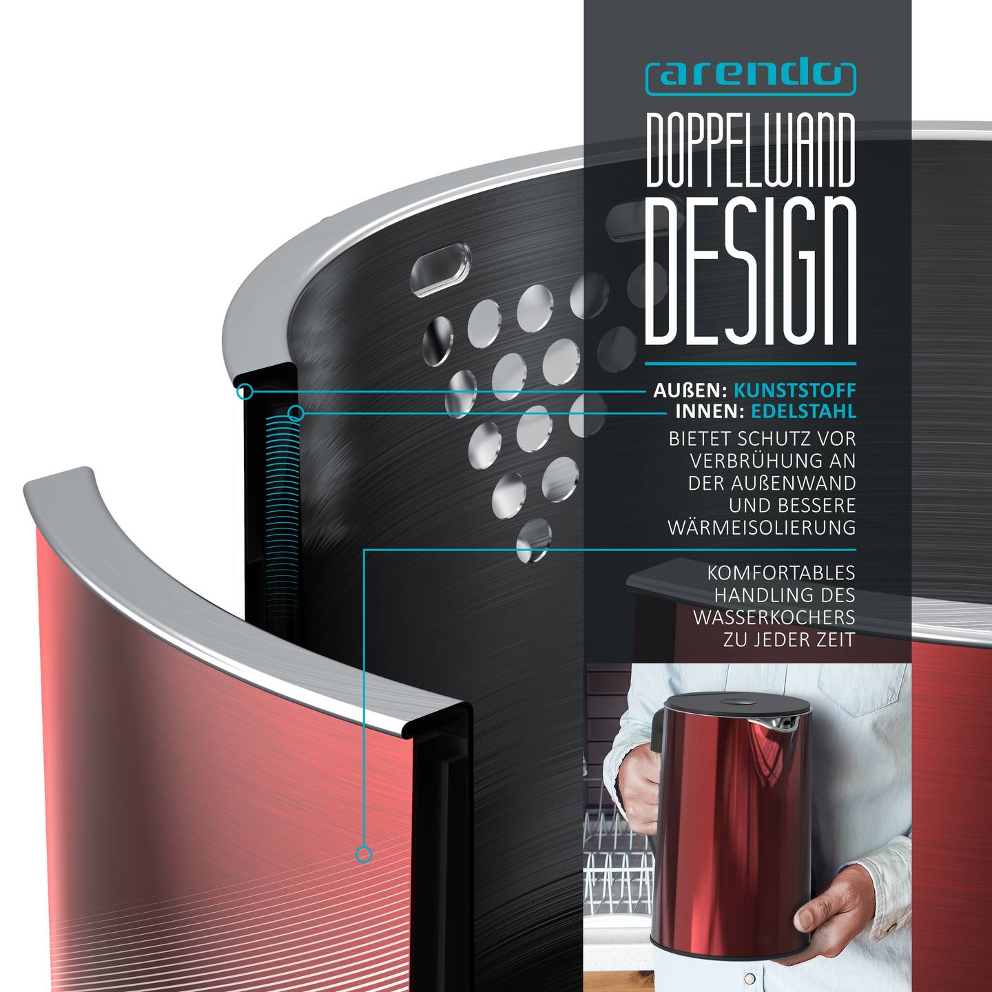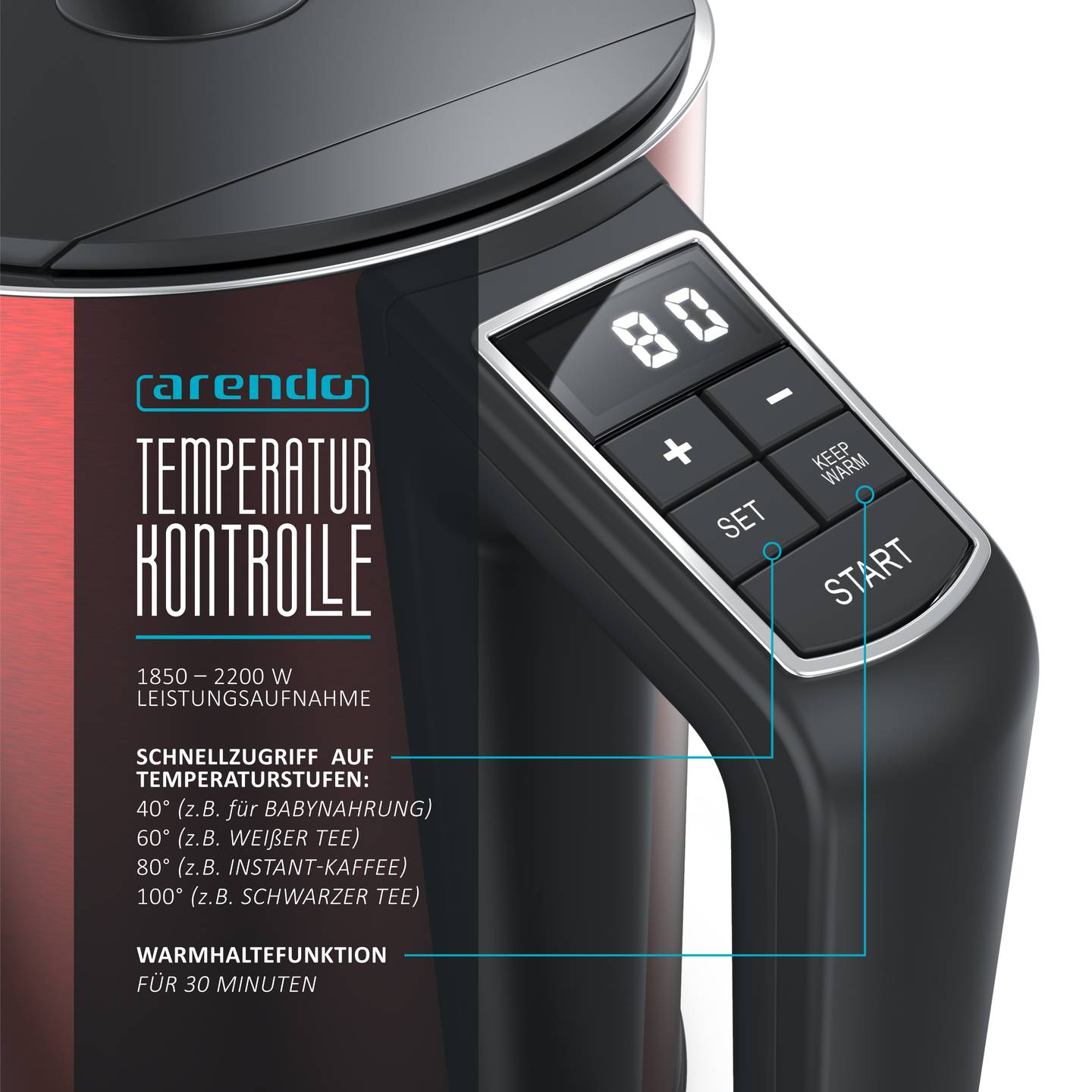 Der Arendo Wasserkocher kombiniert modernes Design mit präziser Temperaturkontrolle und hochwertiger Verarbeitung. Mit seinem doppelwandigen Edelstahlgehäuse, einer Leistung von bis zu 2200 W und frei wählbaren Temperaturen eignet er sich ideal für Tee, Kaffee, Babynahrung und vieles mehr. Durchdachte Sicherheitsfunktionen und eine komfortable Bedienung machen ihn zum zuverlässigen Helfer im Alltag.