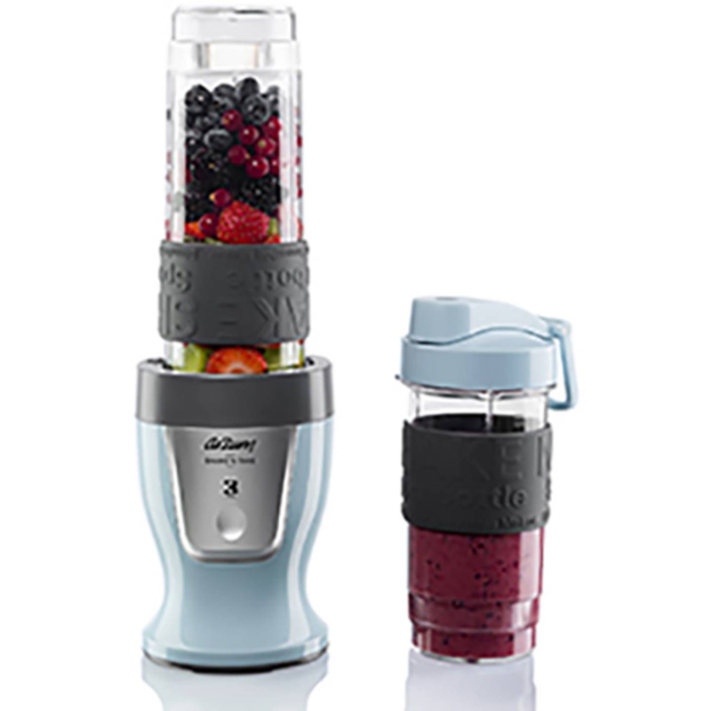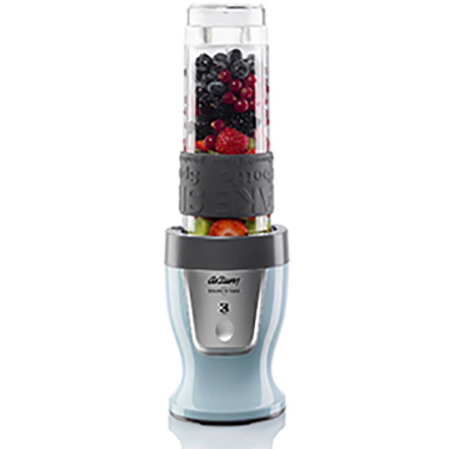Durch sein modernes Design in Hellblau und die kompakte Größe passt der Mixer in jede Küche und ist ideal für einen aktiven, gesundheitsbewussten Lebensstil. Die rutschfeste Unterseite und der Silikongriff sorgen zusätzlich für Stabilität und sicheren Halt während der Nutzung.
