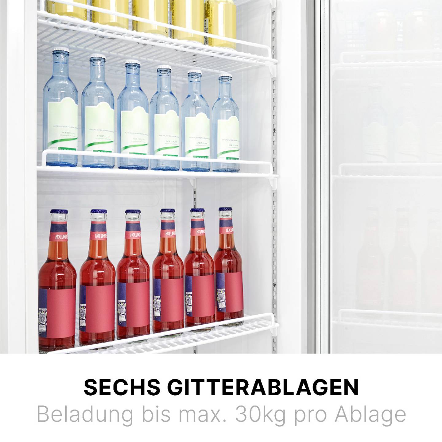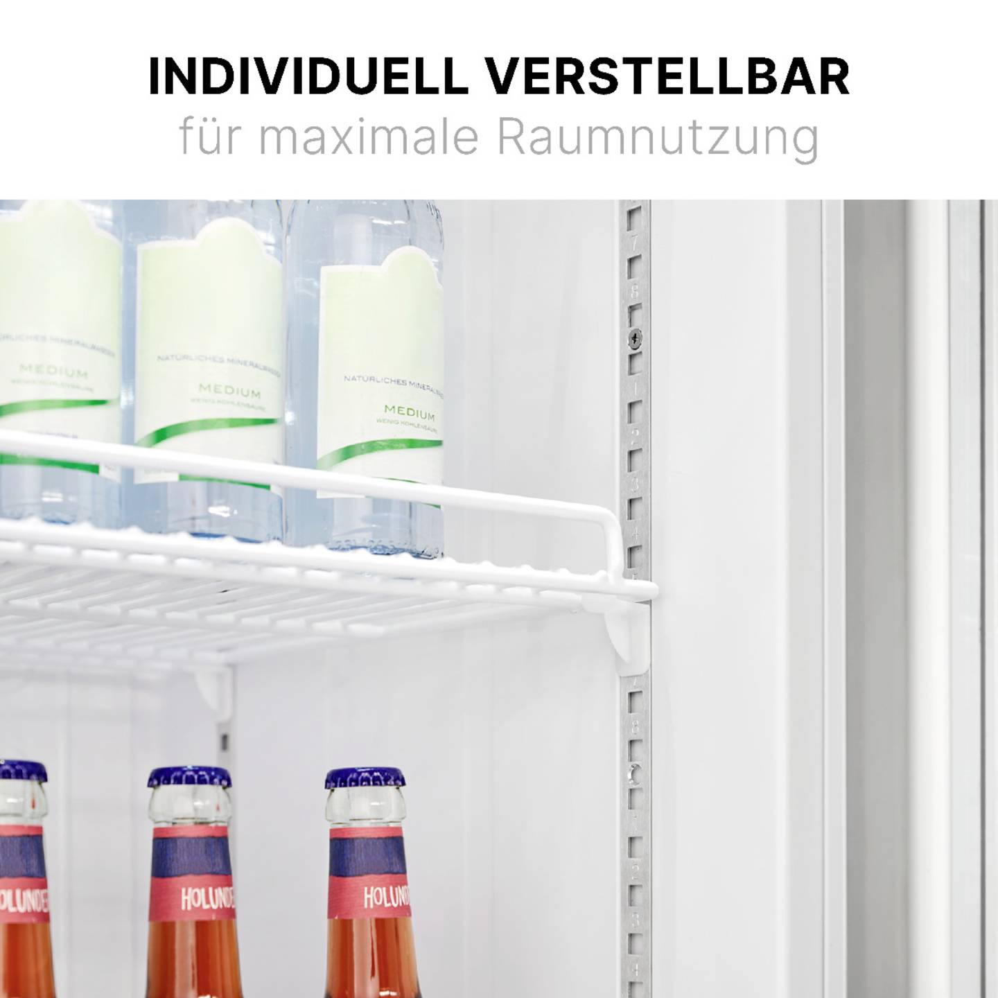 Mit einem Nutzinhalt von 356 Litern und sechs stabilen, höhenverstellbaren Gitterablagen bietet das Gerät viel Platz und flexible Möglichkeiten zur Organisation. Jede Ablage ist belastbar und eignet sich hervorragend für Getränke in unterschiedlichen Größen. Der integrierte Umluftventilator sorgt für eine gleichmäßige Kühlung im gesamten Innenraum, während die stufenlose Temperaturregelung eine präzise Einstellung zwischen 0 °C und +10 °C ermöglicht.