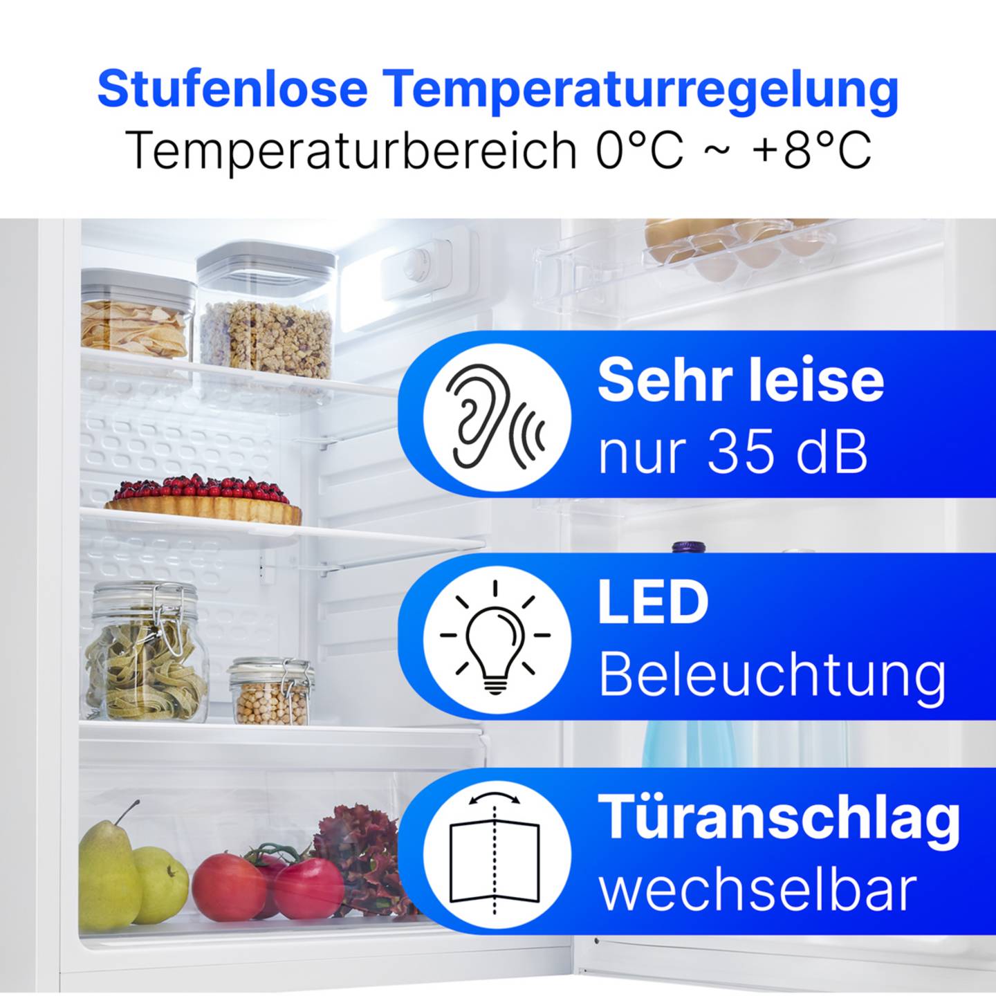 Dank der stufenlosen Temperaturregelung lässt sich der Kühlbereich präzise zwischen 0°C und +8°C einstellen, sodass unterschiedliche Lebensmittel optimal gekühlt werden. Die integrierte LED-Innenbeleuchtung sorgt für eine gleichmäßige Ausleuchtung bei gleichzeitig geringem Energieverbrauch. Zusätzlich ermöglicht der wechselbare Türanschlag eine flexible Anpassung an verschiedene Küchenlayouts.