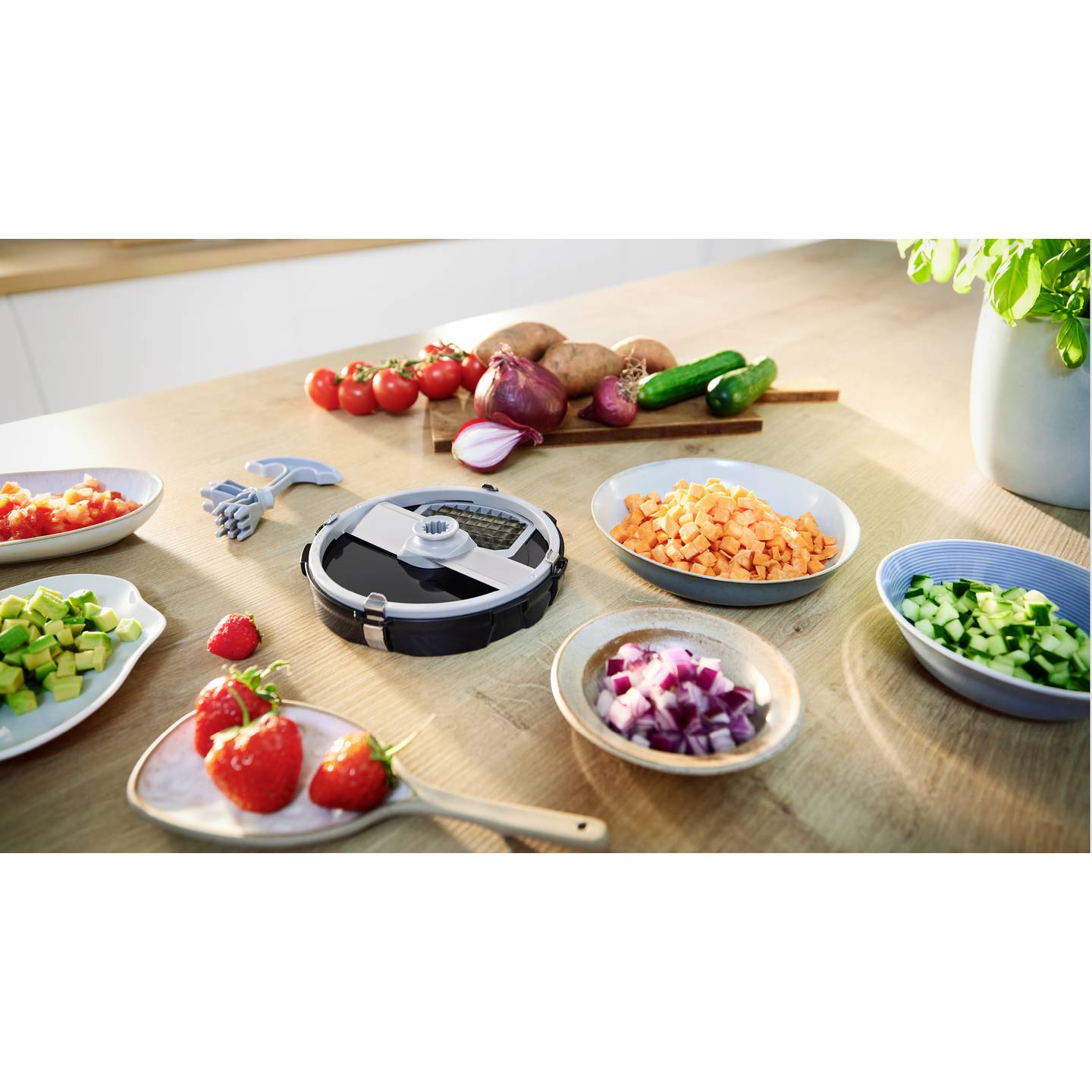- Gleichmäßiges Würfeln von Obst, Gemüse und Fleisch