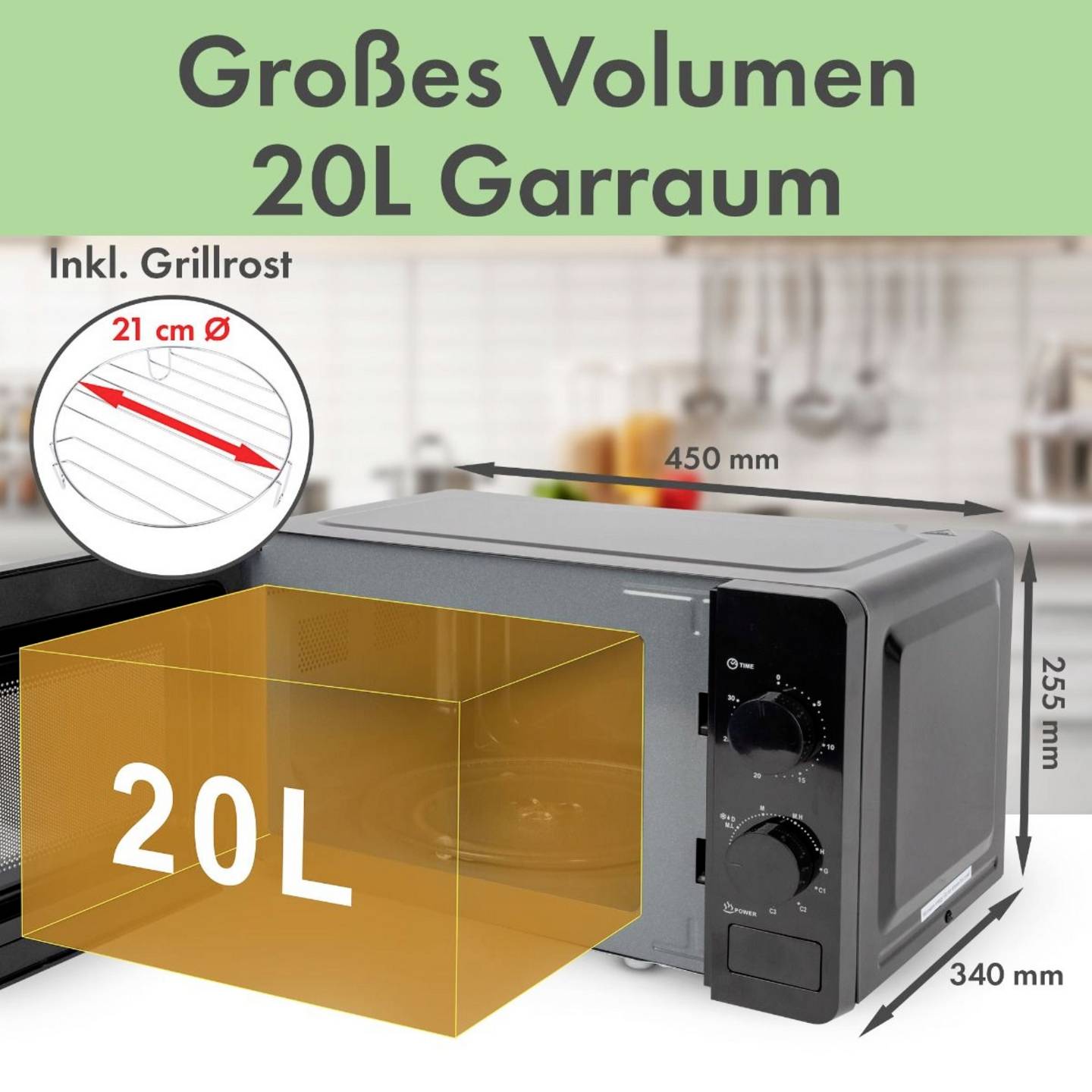 - Großzügiger 20‑Liter-Garraum mit Drehteller für gleichmäßige Erwärmung