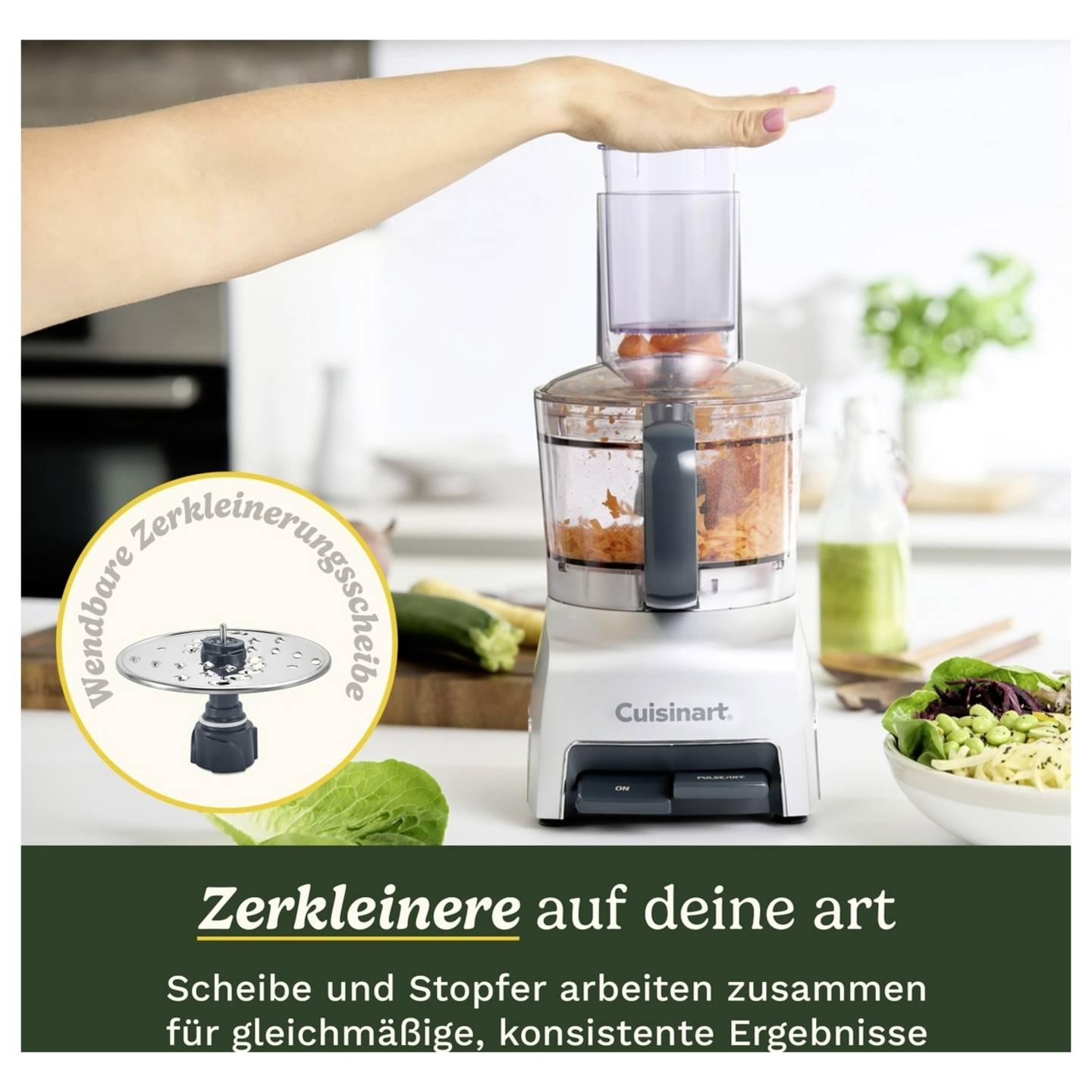 Mit der Cuisinart FlexPrep 5 Küchenmaschine wird die tägliche Küchenarbeit deutlich einfacher und schneller. Das leistungsstarke, kompakte Gerät eignet sich perfekt zum Zerkleinern von Gemüse, zum Mixen von Saucen, zum Zubereiten von Pesto oder zum Aufschlagen von Sahne. Dank der robusten Edelstahlklinge und der praktischen Wendeschneid- und Raspelscheibe lassen sich unterschiedlichste Zutaten mühelos verarbeiten. Der integrierte Stopfer sorgt dafür, dass Zutaten gleichmäßig zugeführt werden und stets konsistente Ergebnisse entstehen. Rutschfeste Füße bieten zusätzliche Stabilität während des Betriebs, während das BladeLock-System für mehr Sicherheit sorgt. Nach der Nutzung lassen sich die abnehmbaren Teile bequem in der Spülmaschine reinigen.
