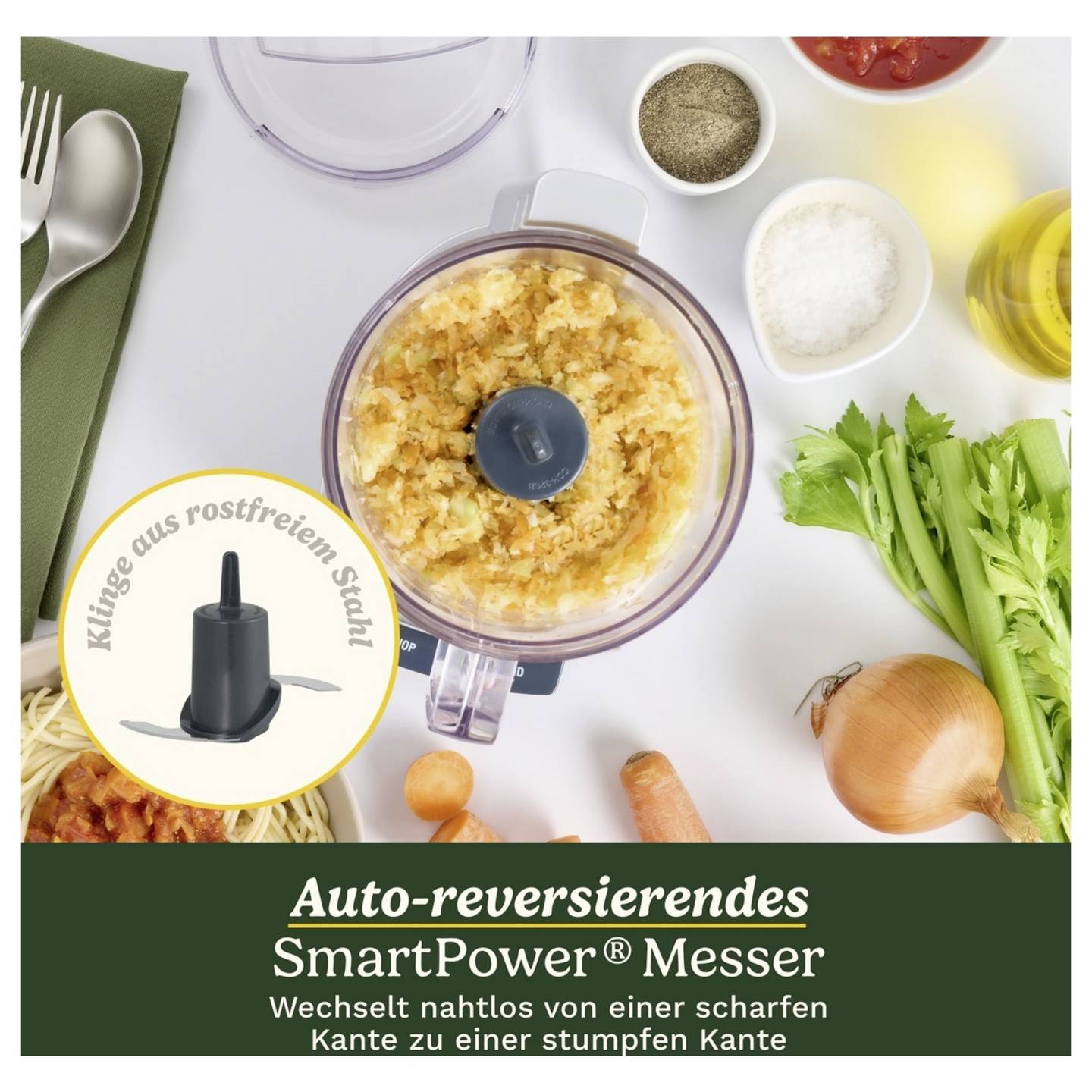 - Auto-Reversing SmartPower®-Klinge für effizientes Zerkleinern harter und weicher Zutaten