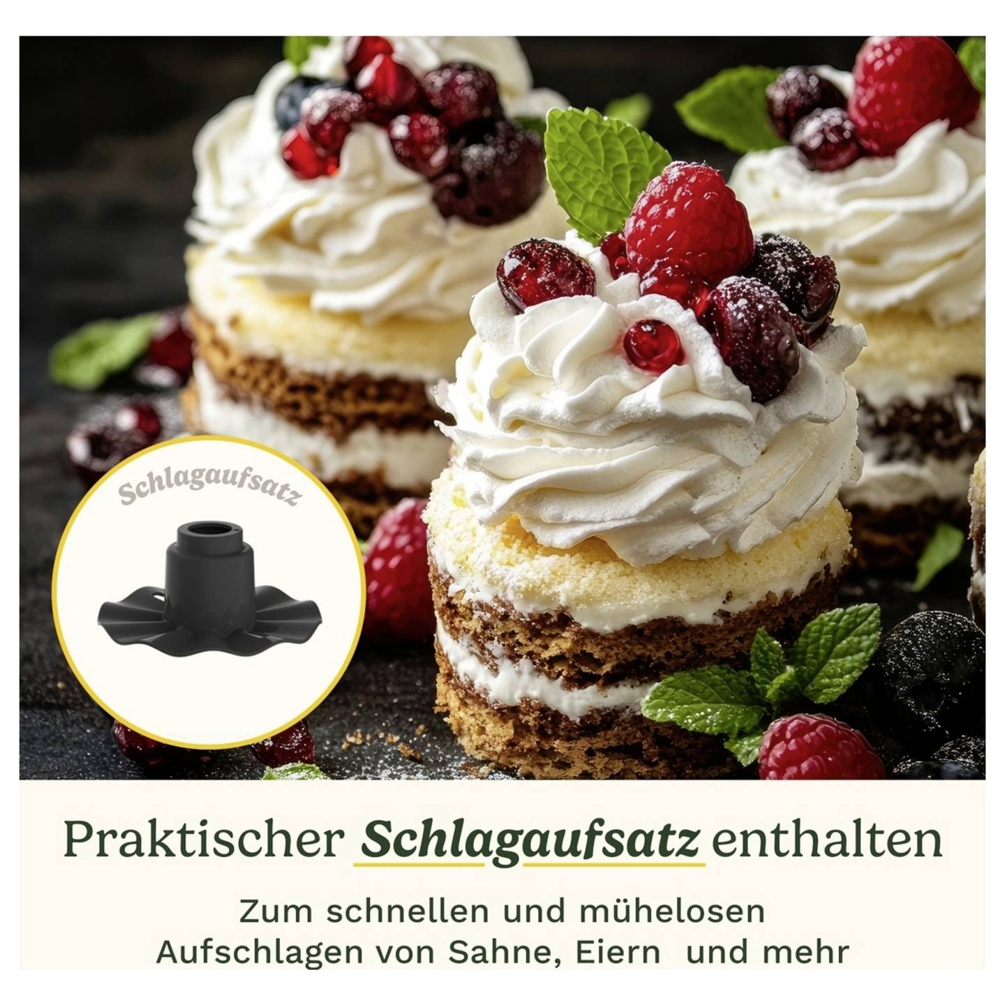 - Inklusive Schlagscheibe zum Aufschlagen von Sahne, Eiern oder cremigen Desserts