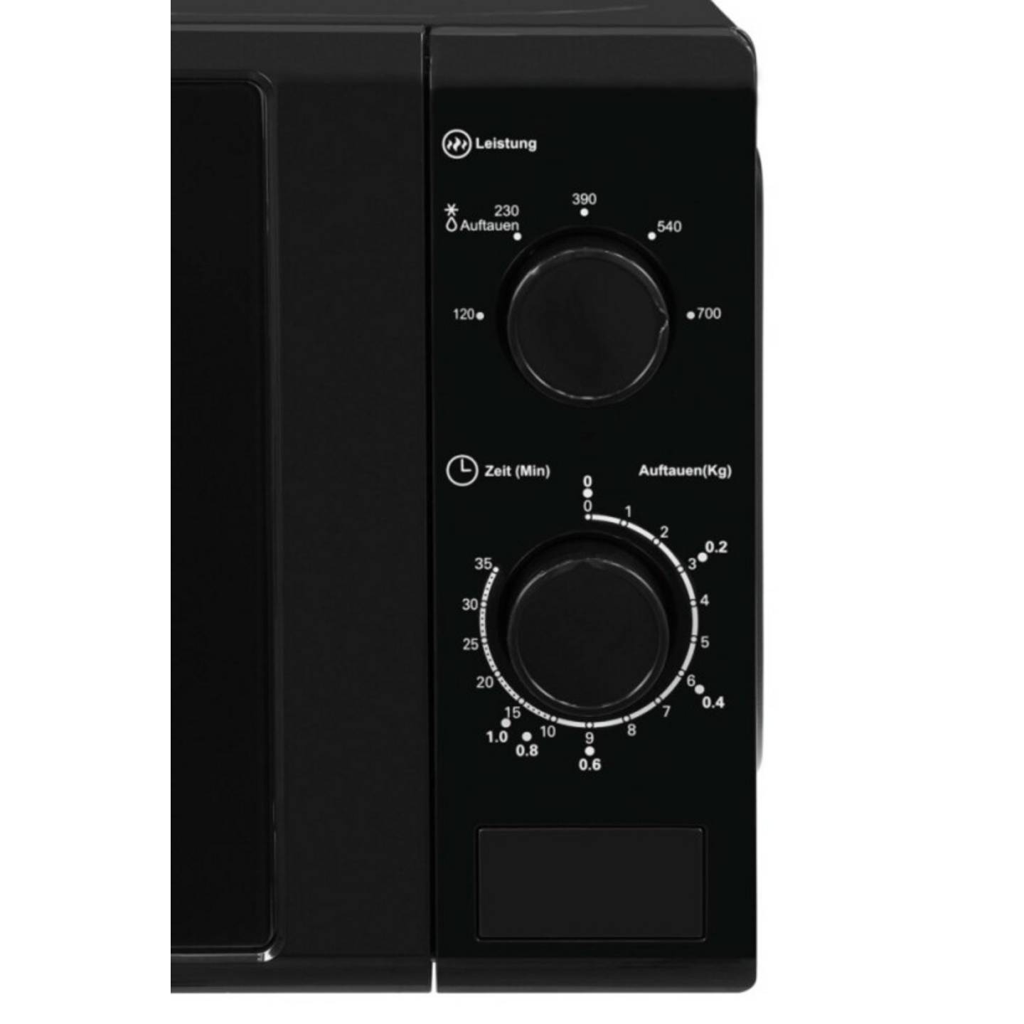 Die Bedienung erfolgt komfortabel über zwei mechanische Drehregler für Leistungsstufe und Timer. Die Zeitschaltuhr lässt sich bis zu 35 Minuten einstellen und informiert mit einem akustischen Signal über das Ende des Programms. Eine Innenbeleuchtung ermöglicht jederzeit einen Blick in den Garraum, während die Tür bequem per Drucktaste geöffnet wird. Dank ihres kompakten Standgeräte-Designs eignet sich die Mikrowelle ideal für kleinere Küchen, Büros oder als praktische Ergänzung zu vorhandenen Küchengeräten.