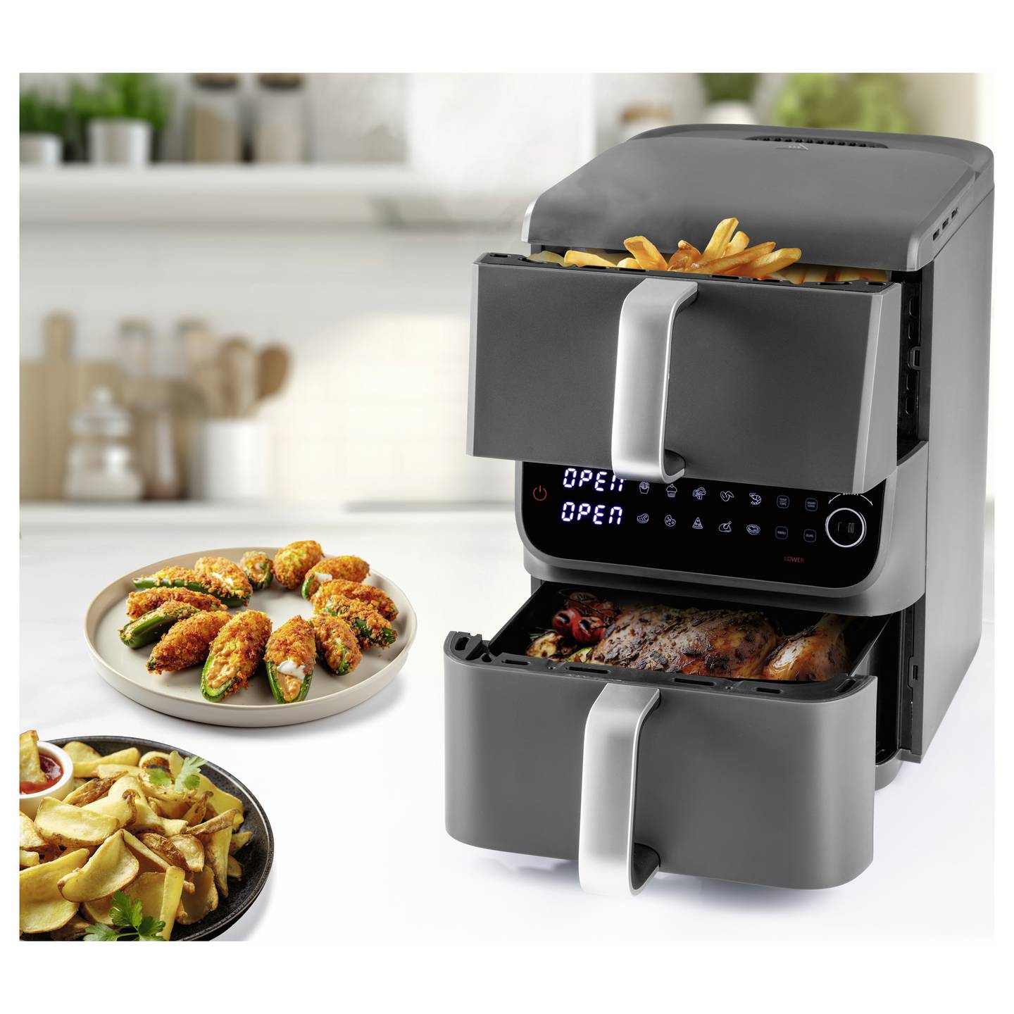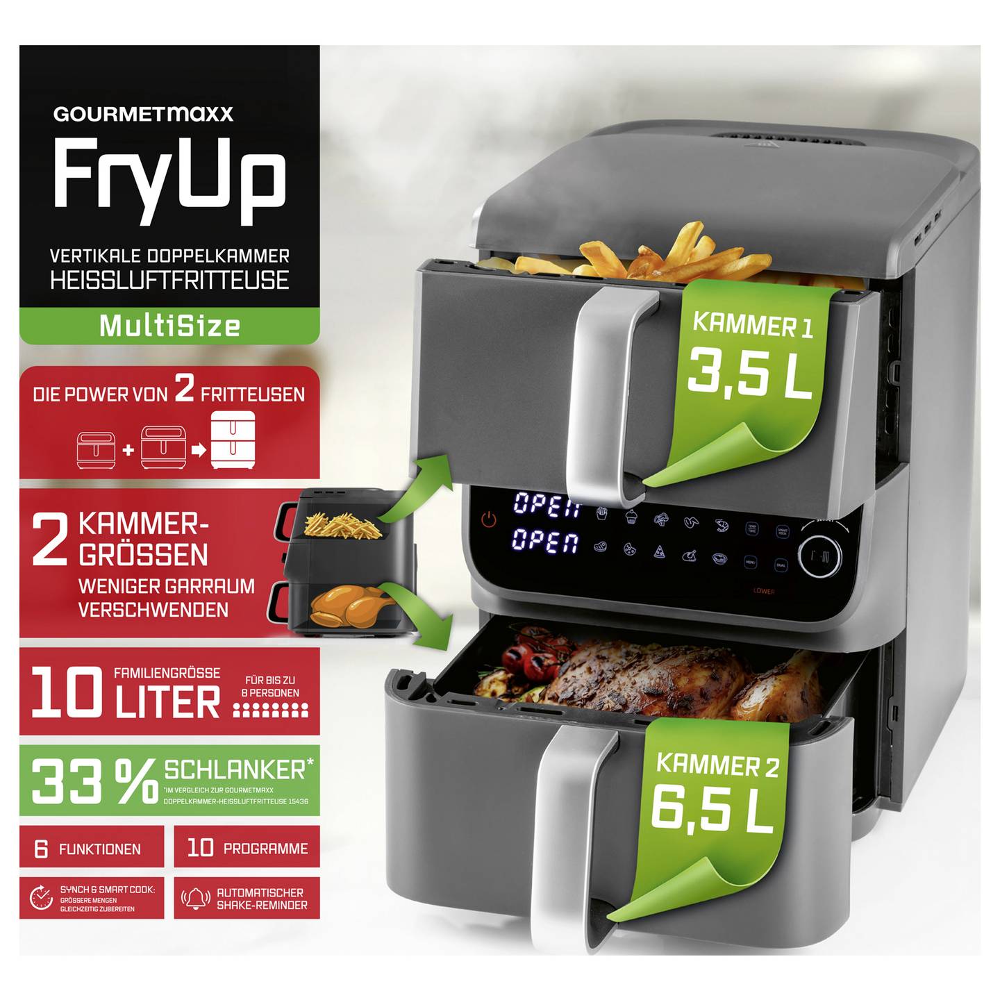 Die GOURMETmaxx FryUp Doppelkammer-Heißluftfritteuse bringt vielseitige Kochmöglichkeiten in deine Küche. Dank der zwei übereinanderliegenden Frittierkörbe mit unterschiedlichen Größen nutzt du den Garraum besonders effizient und kannst verschiedene Speisen gleichzeitig zubereiten. Mit bis zu 200 °C, zwei Heizelementen und einem leistungsstarken Ventilator sorgt das Gerät für eine optimale Hitzezirkulation und gleichmäßige, knusprige Ergebnisse – ganz ohne klassische Fritteuse.