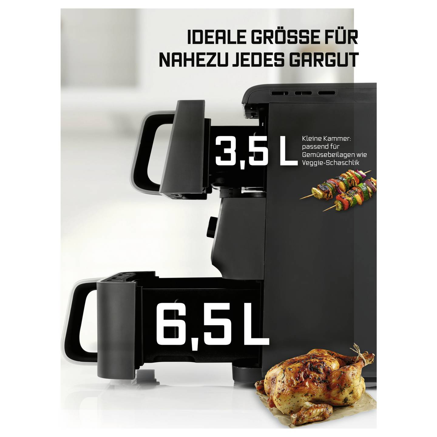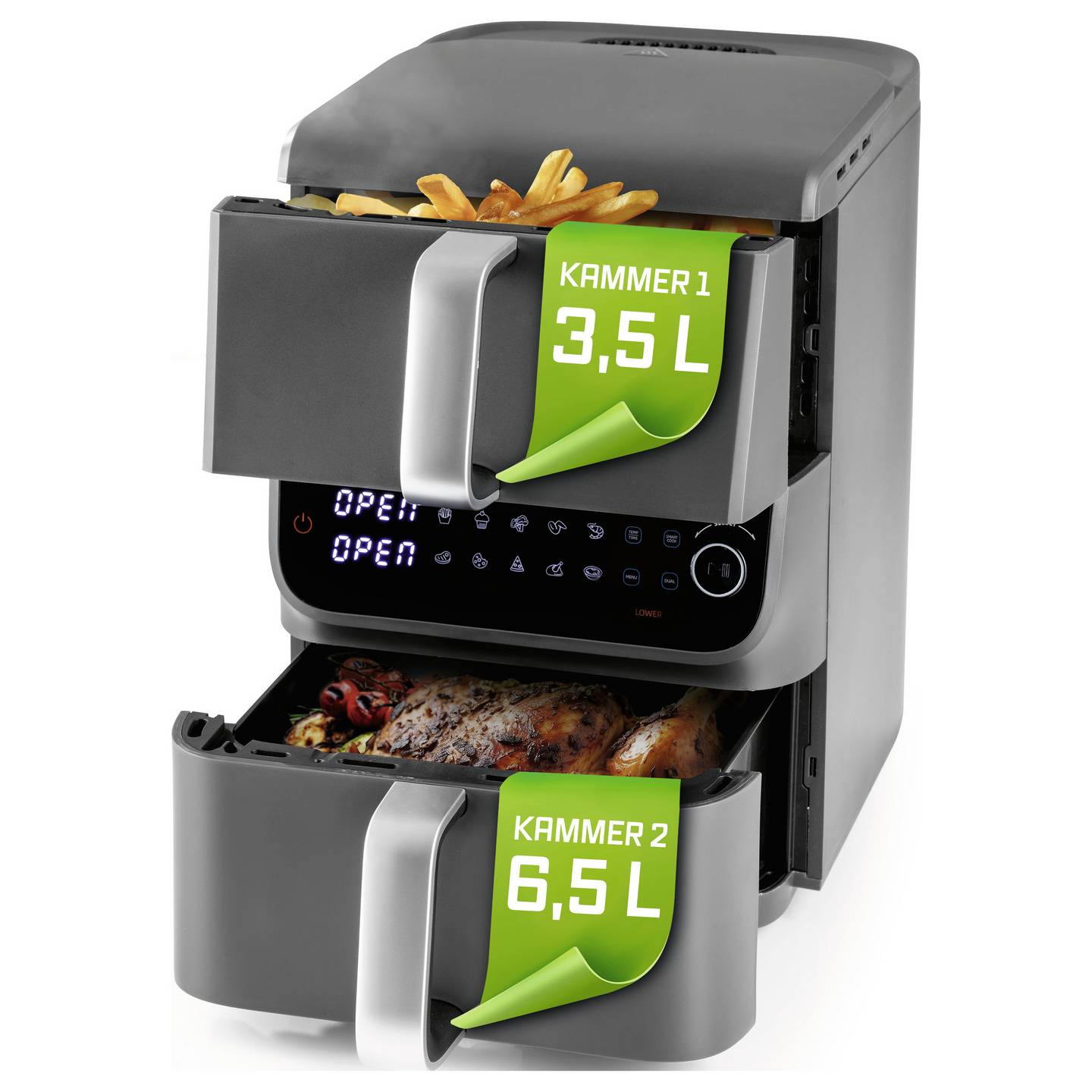 - Doppelkammer-System mit 3,5 L und 6,5 L für gleichzeitiges Zubereiten verschiedener Speisen