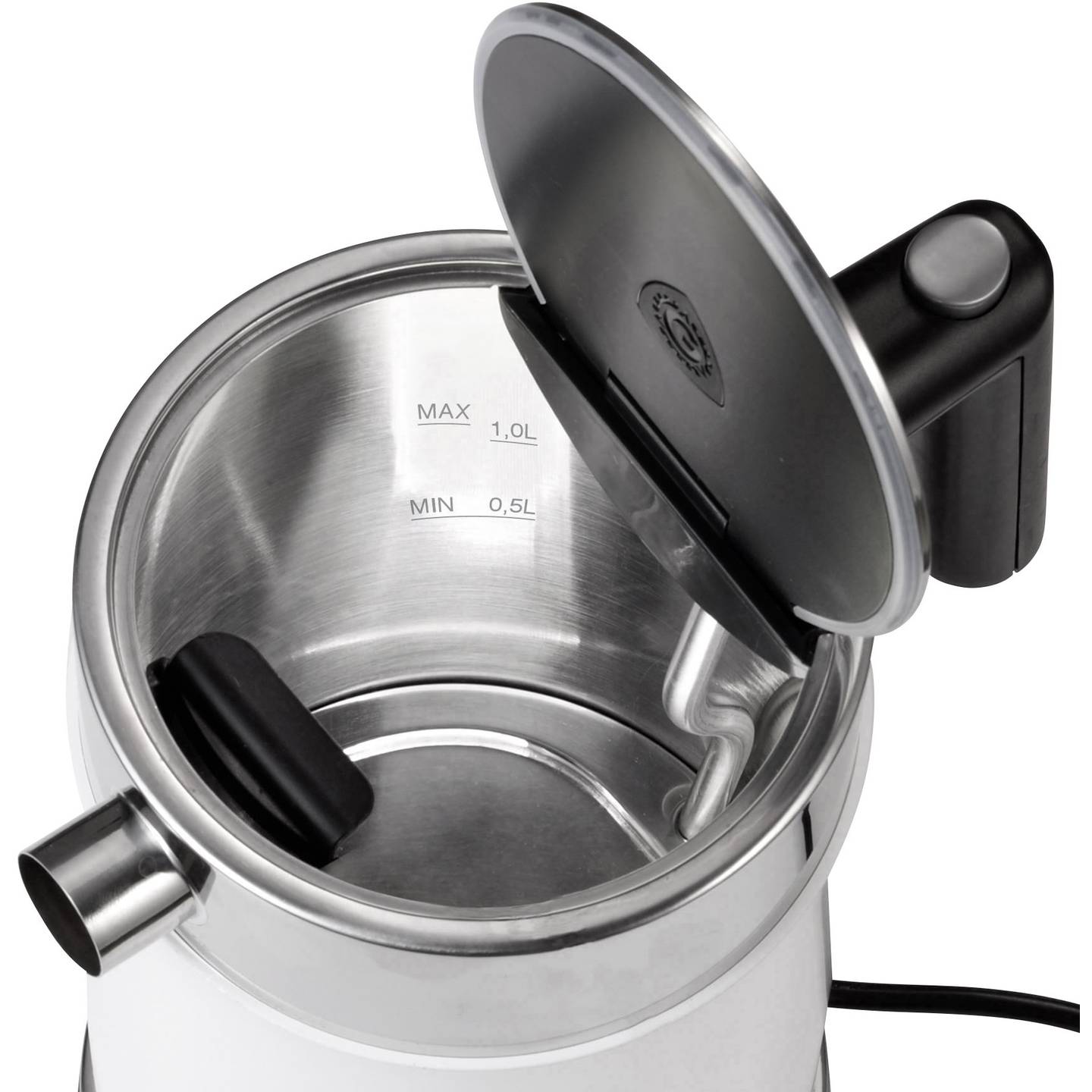 Der praktische Deckel öffnet sich per Knopfdruck und erleichtert das Befüllen. Zusätzlich sorgt der herausnehmbare, abwaschbare Kalkfilter für sauberes Wasser und verbessert den Geschmack von Heißgetränken. Mit seinem zeitlosen weißen Design fügt sich der Wasserkocher harmonisch in jede moderne Küche ein.