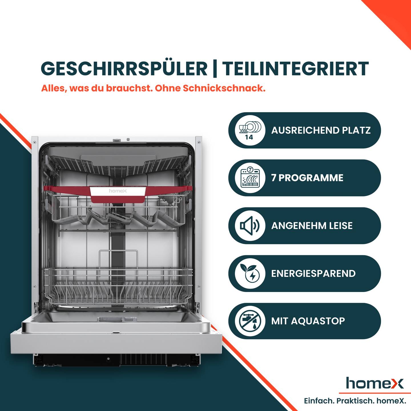 Der teilintegrierbare homeX Geschirrspüler mit 60 cm Breite bietet eine leistungsstarke und zugleich komfortable Lösung für den täglichen Abwasch. Mit sieben unterschiedlichen Spülprogrammen passt sich das Gerät flexibel an verschiedene Verschmutzungsgrade und Geschirrarten an – von empfindlichen Gläsern bis hin zu stark verschmutzten Töpfen und Pfannen. Zusatzfunktionen wie Extra Reinigung und Extra Trocknen verbessern das Spülergebnis und sorgen für glänzend sauberes Geschirr.