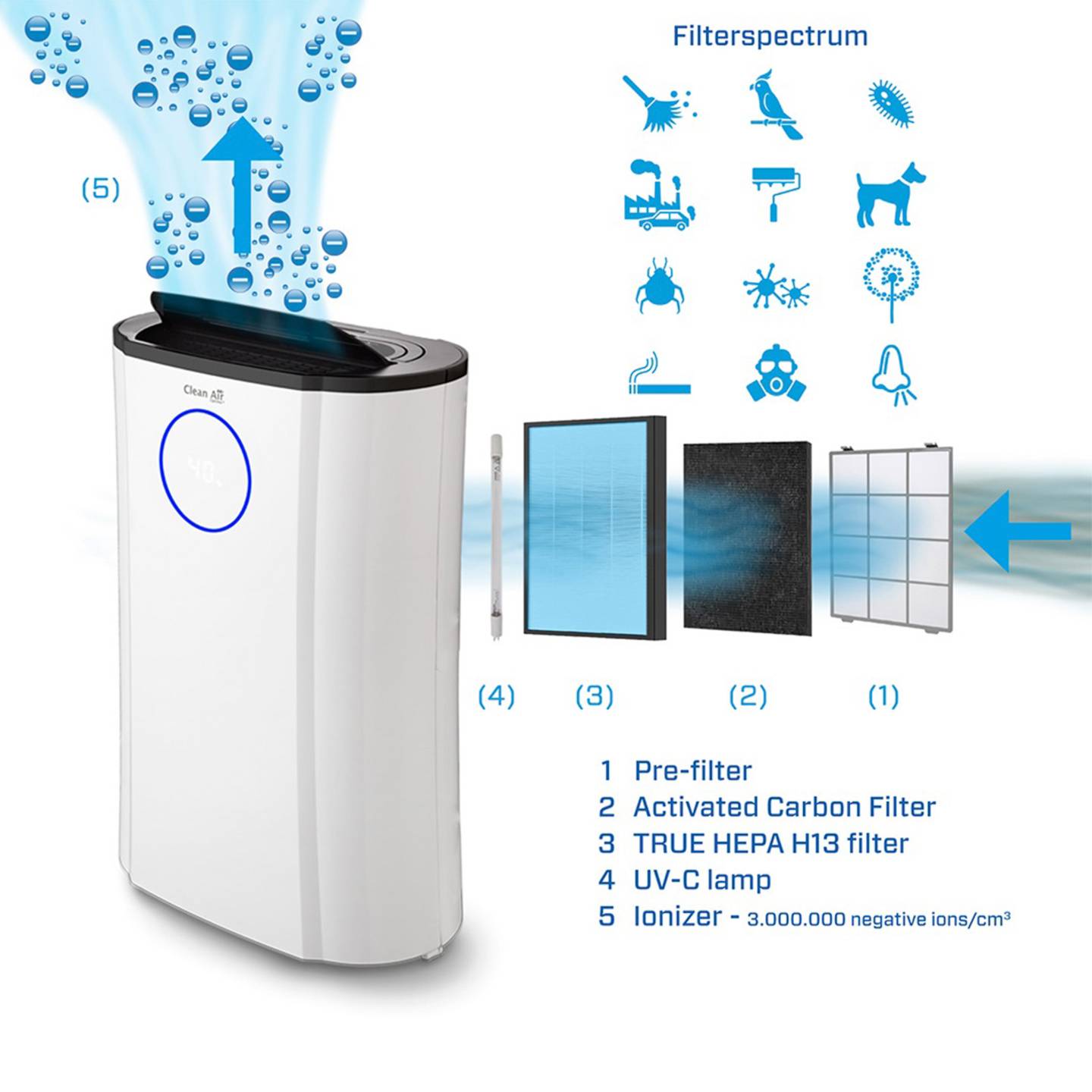 - TRUE HEPA H13 Filter mit Nano‑Silber‑Beschichtung entfernt bis zu 99,97 % der Partikel