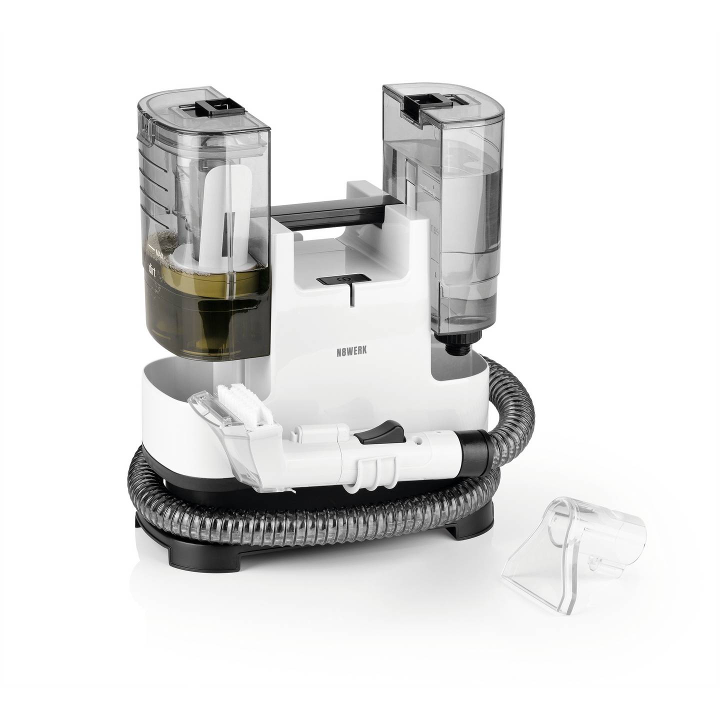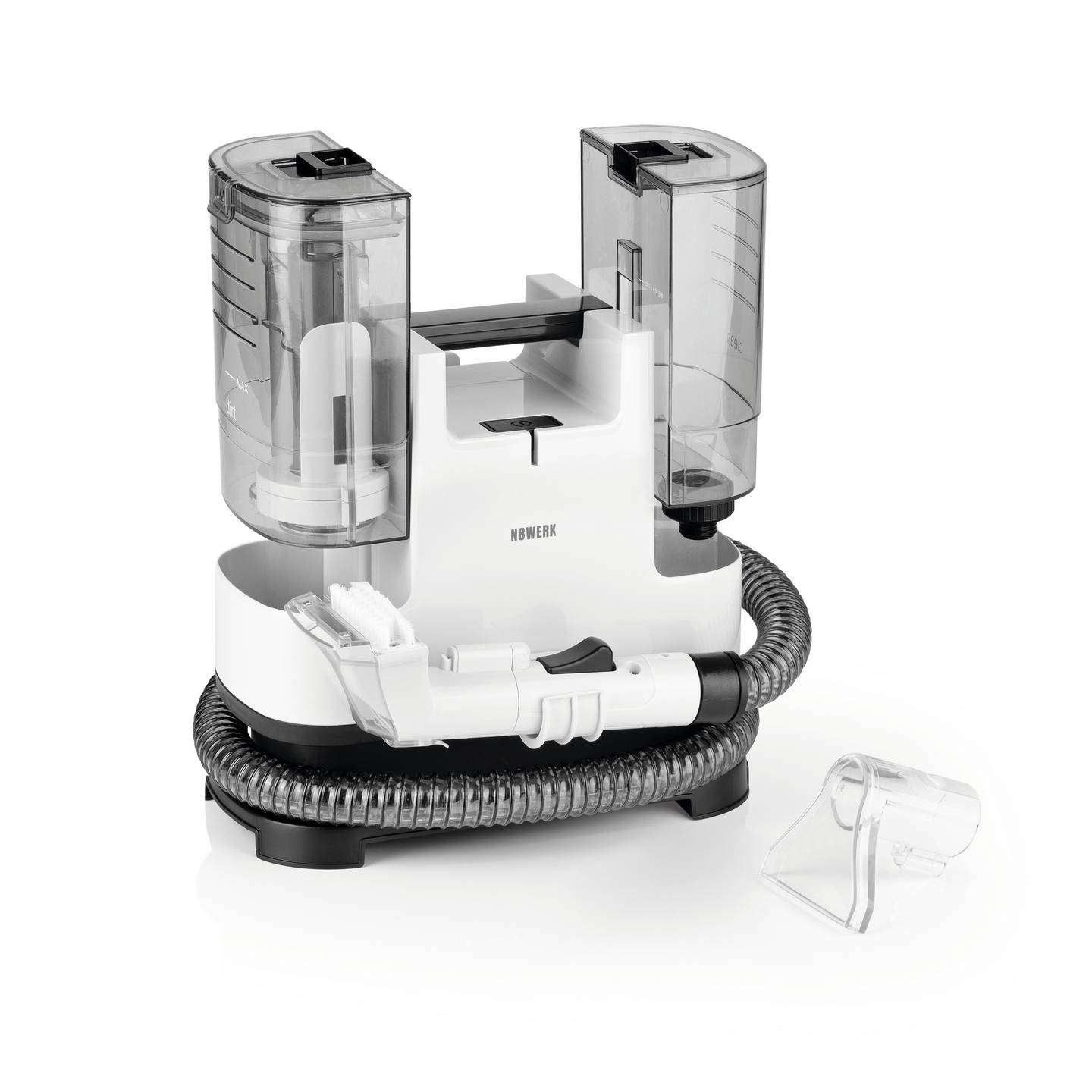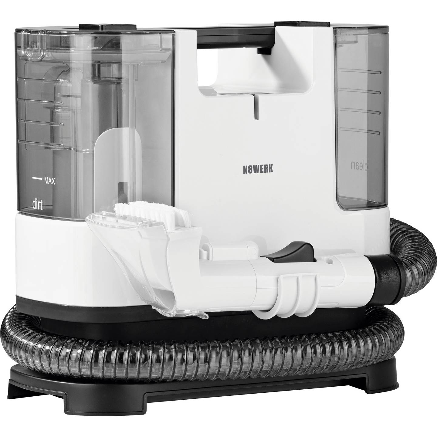 Der N8WERK Teppichreiniger mit Sprühbehälter sorgt für eine tiefgehende Reinigung von Teppichen, Polstern und Autositzen. Dank kombinierter Sprüh- und Saugleistung entfernt das Gerät effektiv Flecken, Staub und festgesetzten Schmutz. Durch das kompakte, tragbare Design eignet sich der Reiniger ideal für den Einsatz im Haushalt sowie im Auto.