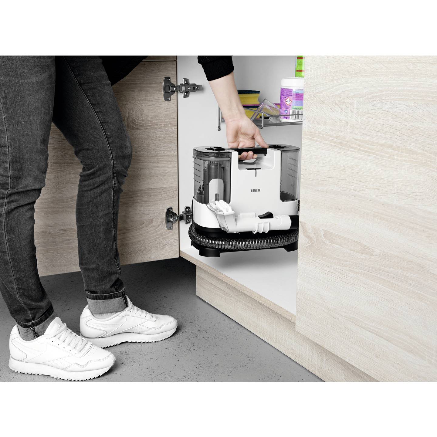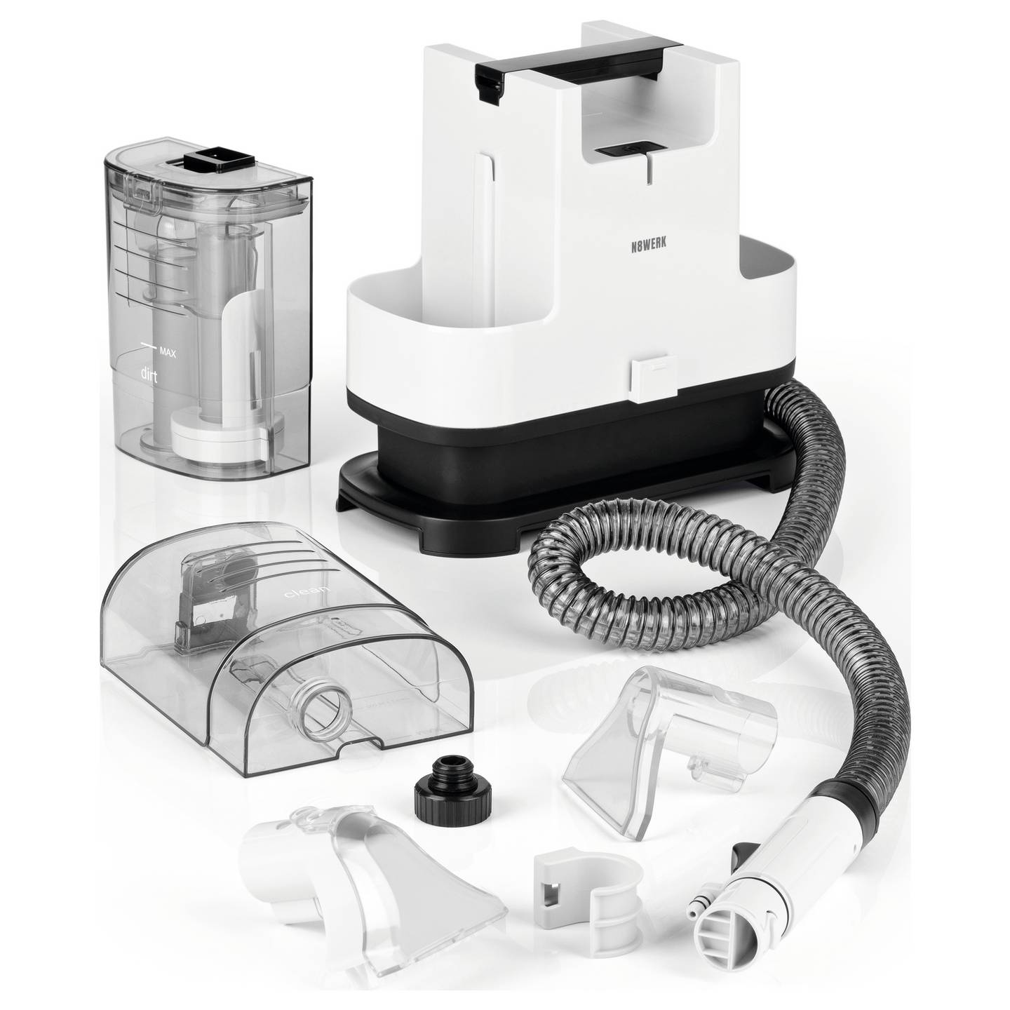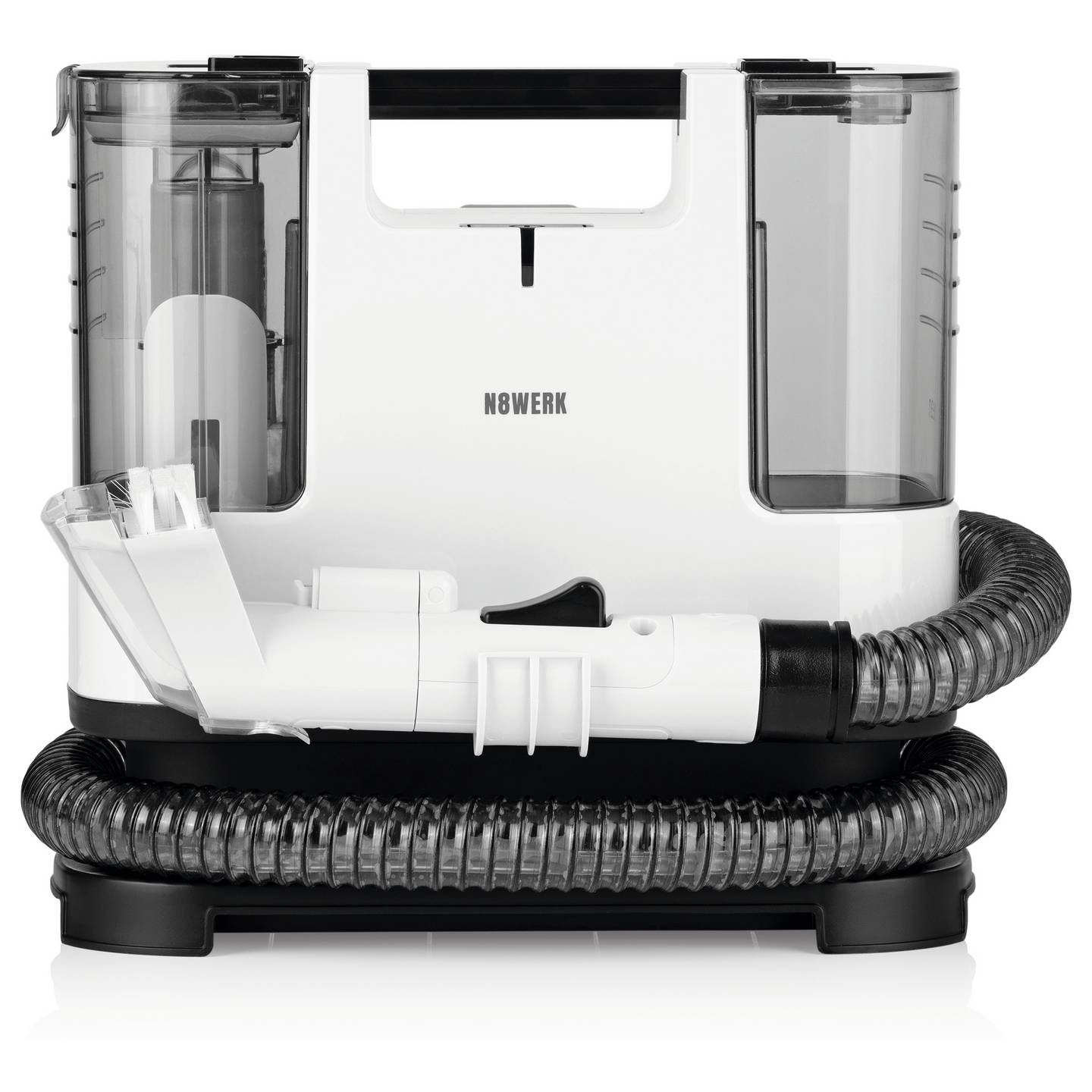 Der N8WERK Teppichreiniger mit Sprühbehälter sorgt für eine tiefgehende Reinigung von Teppichen, Polstern und Autositzen. Dank kombinierter Sprüh- und Saugleistung entfernt das Gerät effektiv Flecken, Staub und festgesetzten Schmutz. Durch das kompakte, tragbare Design eignet sich der Reiniger ideal für den Einsatz im Haushalt sowie im Auto.