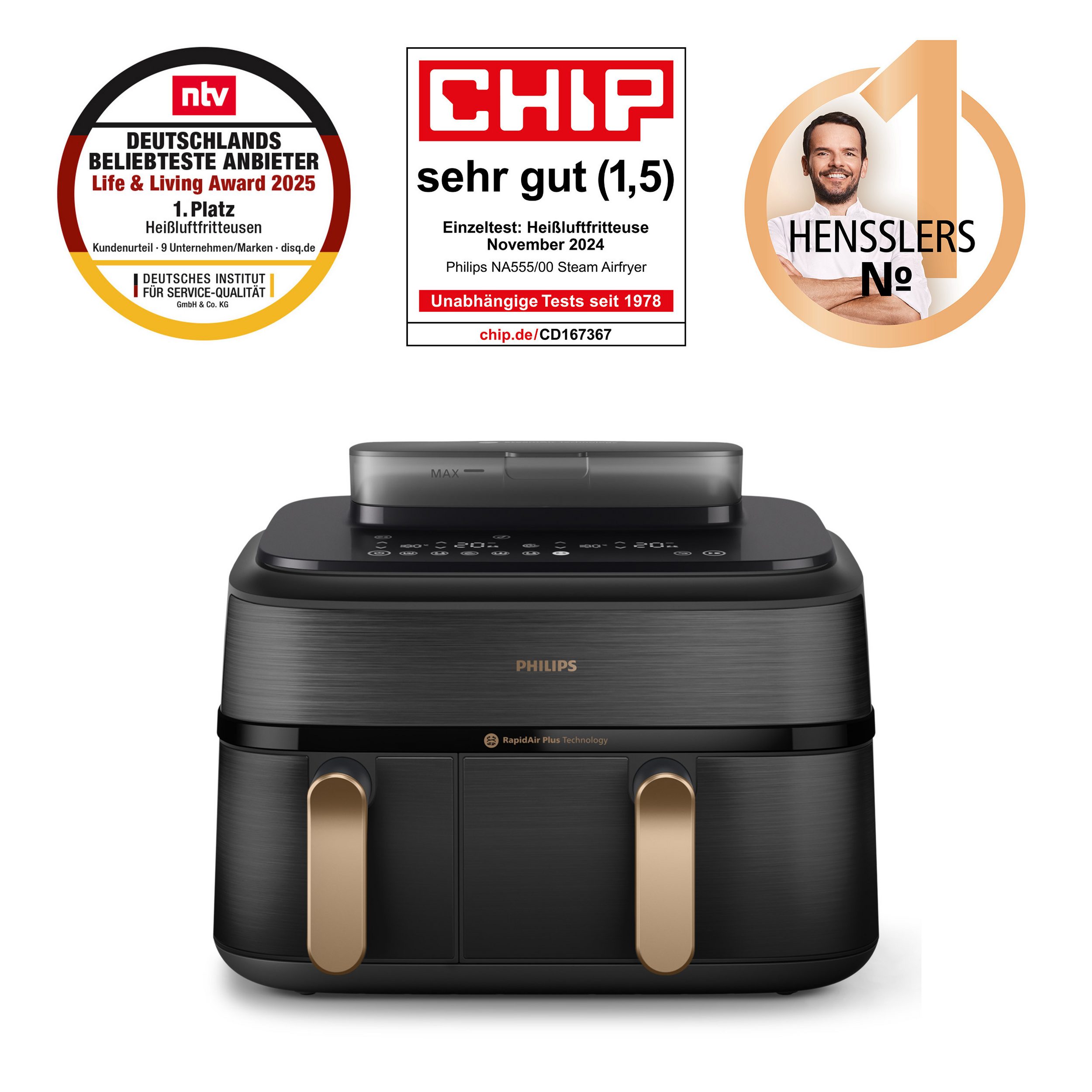 Ich liebe diesen Airfryer! Die Dual-Basket-Funktion mit dem synced Timer ist ein brillantes Feature. Abends Ravioli im Dampfkorb und Hähnchenkeulen im großen Korb – alles gleichzeitig fertig. Die HomeID App hat tolle Rezepte. Super Gerät!