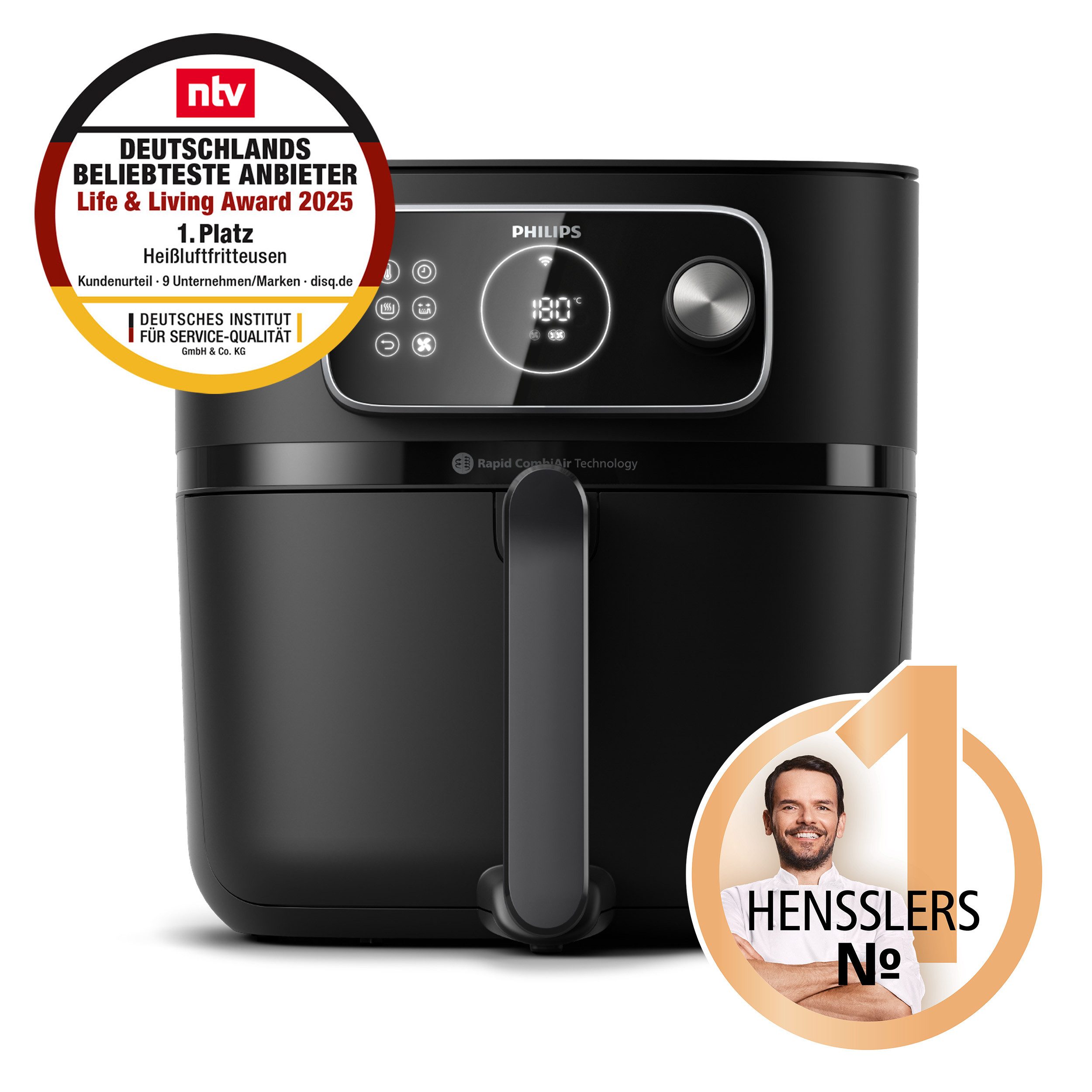 Mit der Philips 7000 Series verbundenen Airfryer-Kombi XXL HD9876 gelingen die Lieblingsmahlzeiten im Handumdrehen. Für die Essenszubereitung nach dem persönlichen Geschmack ist sie mit einer Rapid CombiAir Technologie ausgestattet, die Garzeit, Temperatur und Luftgeschwindigkeit automatisch anpasst. Dank der vielseitigen Kochfunktionen lässt sich der Airfryer zum Frittieren, Grillen, Backen, Toasten sowie auch Auftauen und Schmoren verwenden. Durch die XXL-Kapazität von 2 kg ermöglicht es die Zubereitung von Speisen für mehr als sieben Personen in einem Durchgang.