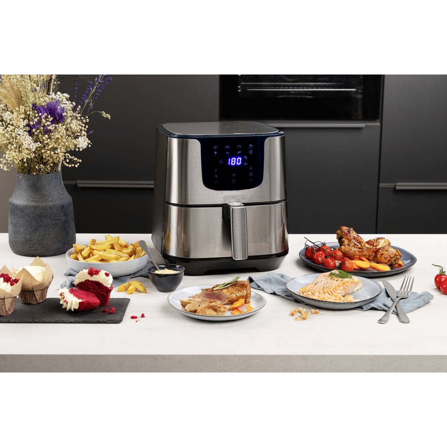 Das moderne Edelstahlgehäuse in Kombination mit dem digitalen Bedienfeld verleiht der Fritteuse ein elegantes Erscheinungsbild, das in jede Küche passt. Über das intuitive Display lassen sich Temperatur und Timer bequem einstellen. Der Temperaturbereich von 80 bis 200 °C ermöglicht vielseitige Zubereitungsmöglichkeiten – vom schonenden Garen bis zum knusprigen Frittieren.