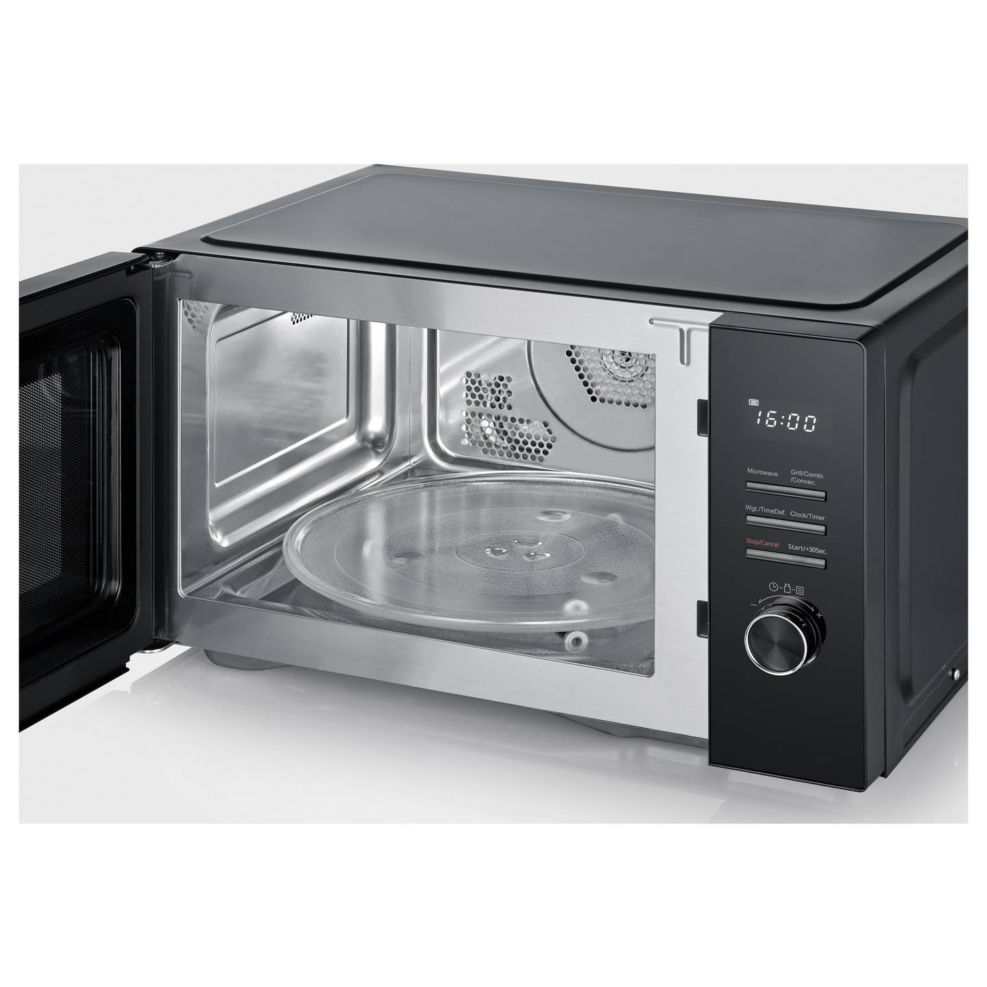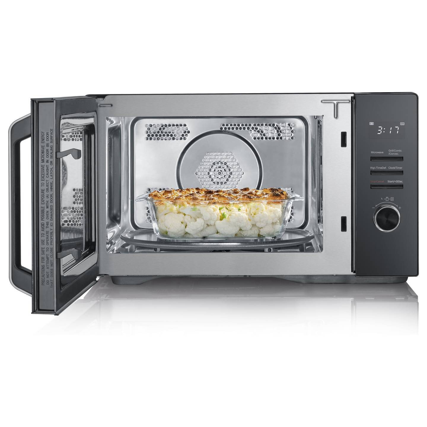 - Leistungsstarke 900-Watt-Mikrowelle mit zusätzlicher Grill- und Heißluftfunktion