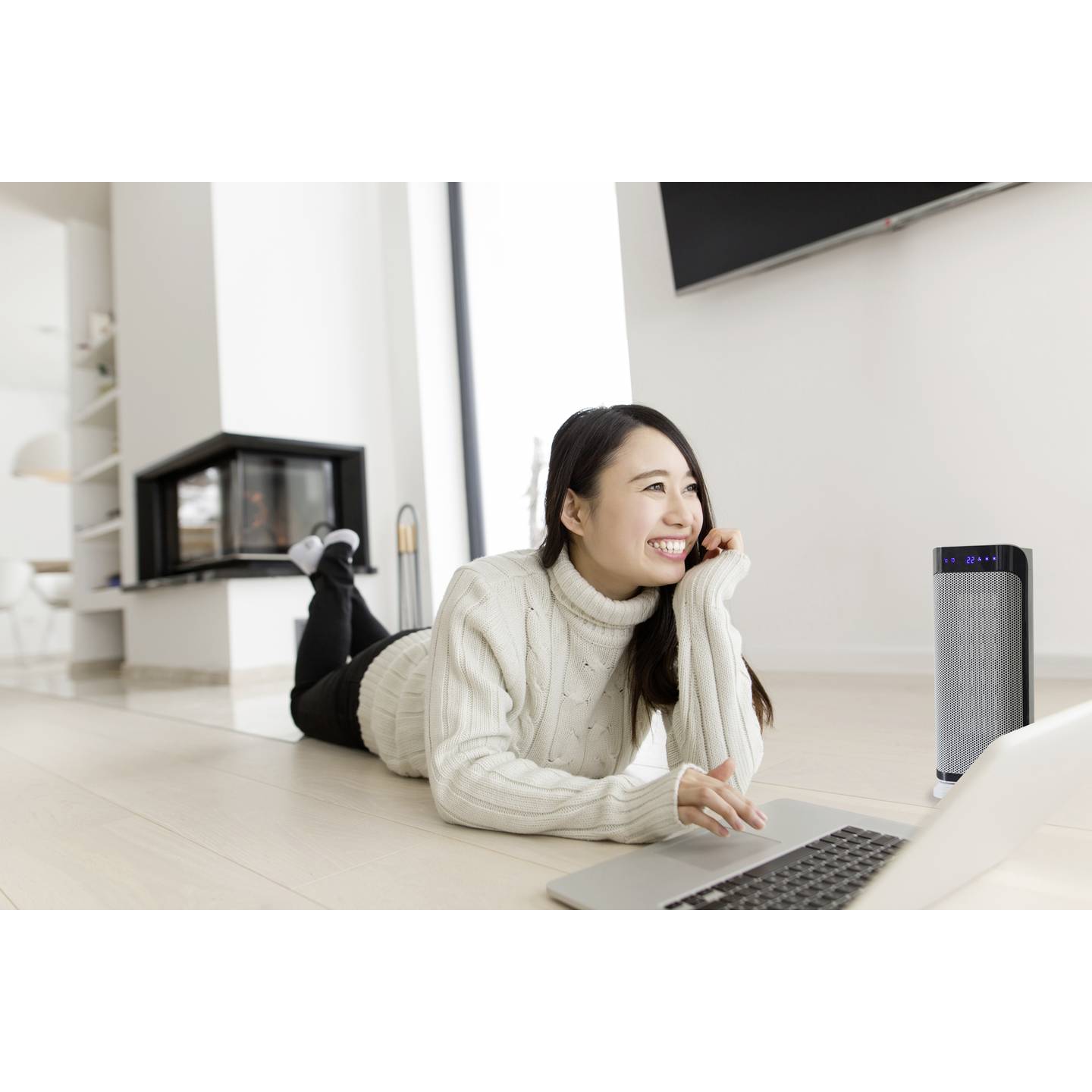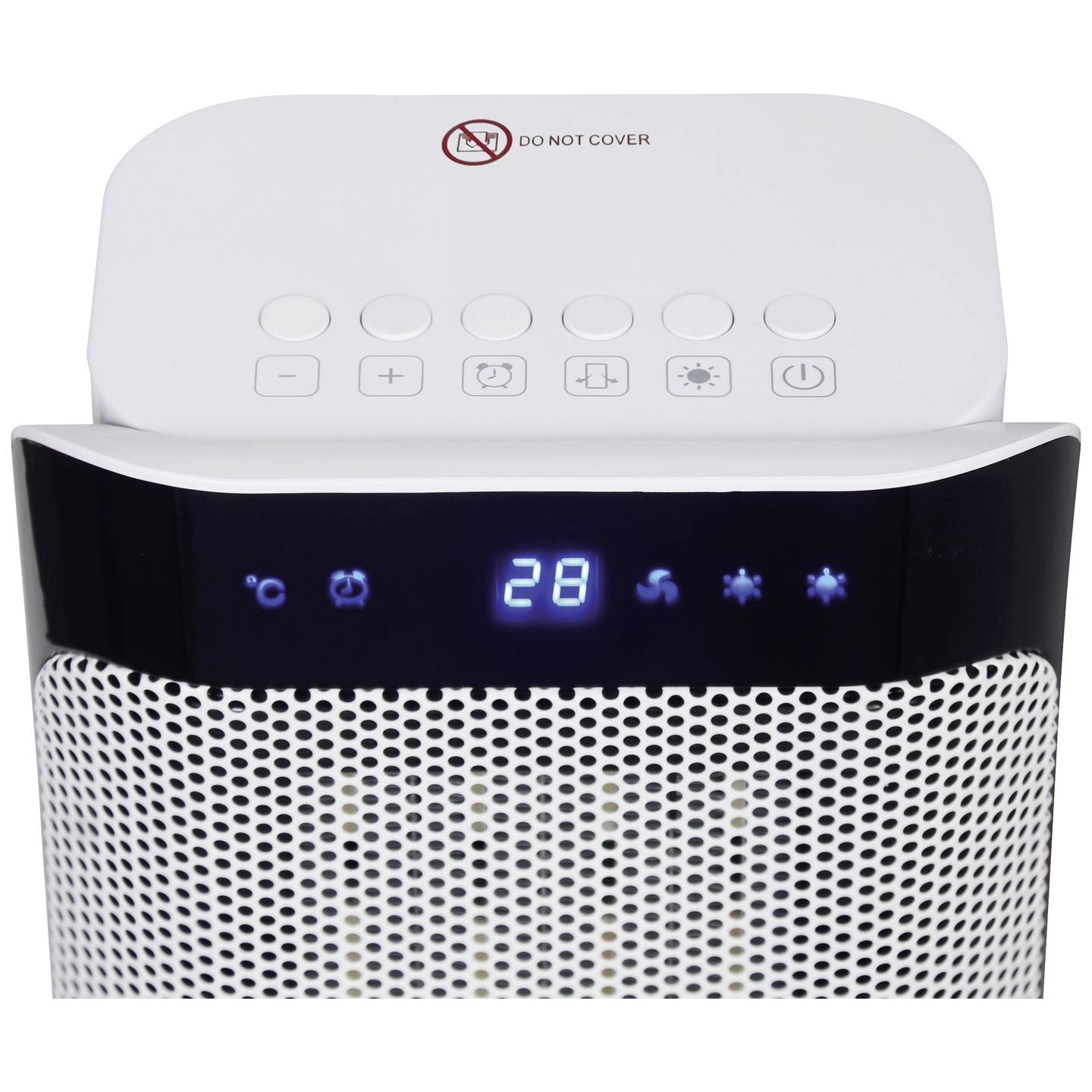 Für zusätzlichen Komfort sorgt die mitgelieferte Fernbedienung, mit der sich alle Funktionen bequem aus der Entfernung steuern lassen. Ein integrierter Timer erlaubt die automatische Abschaltung nach bis zu acht Stunden. Sicherheitsfunktionen wie Überhitzungsschutz und Kippschutz sorgen dafür, dass sich der Heizlüfter bei ungewöhnlichen Situationen automatisch abschaltet. Durch seine schlanke Bauform eignet sich das Gerät besonders gut für kleinere Räume oder als zusätzliche Wärmequelle.