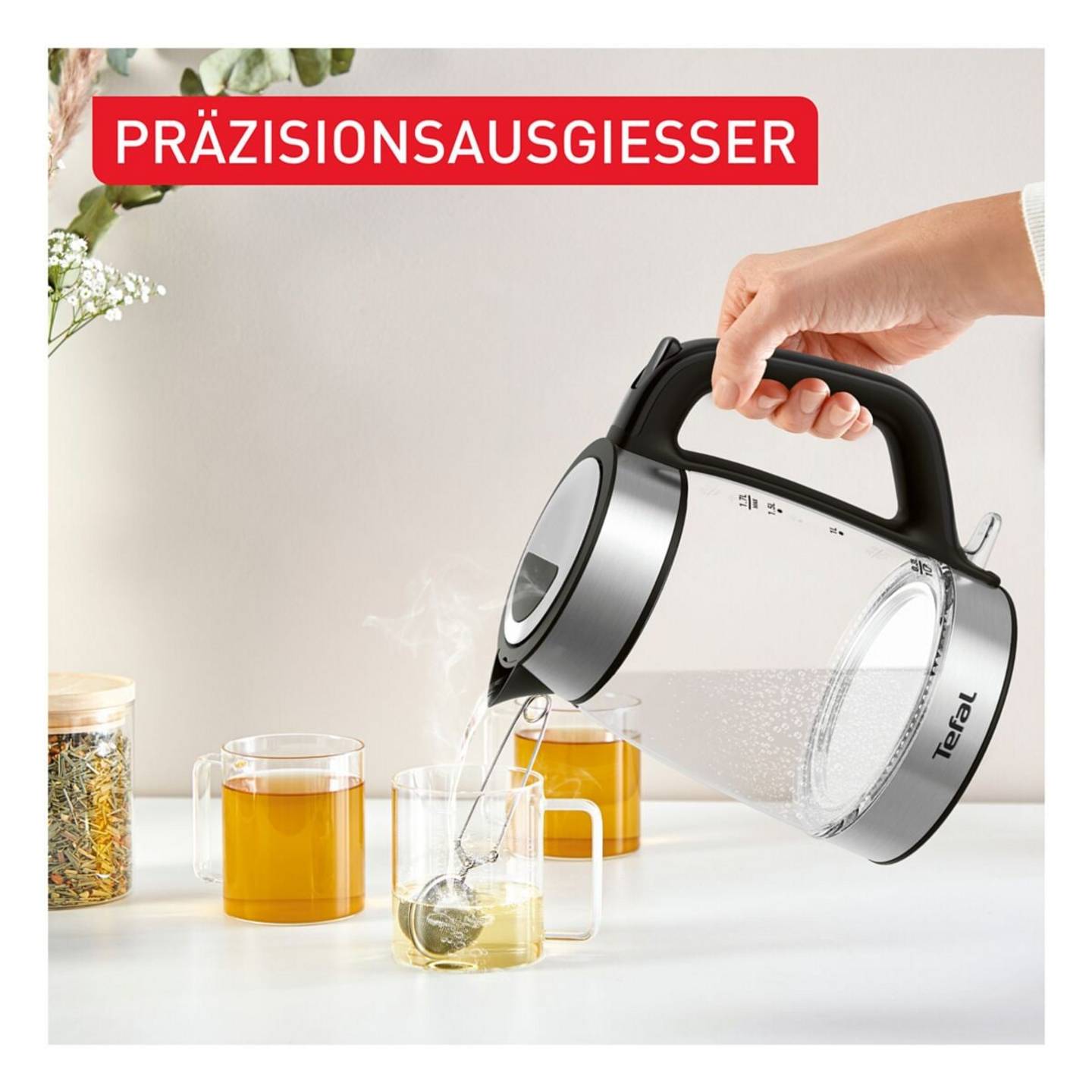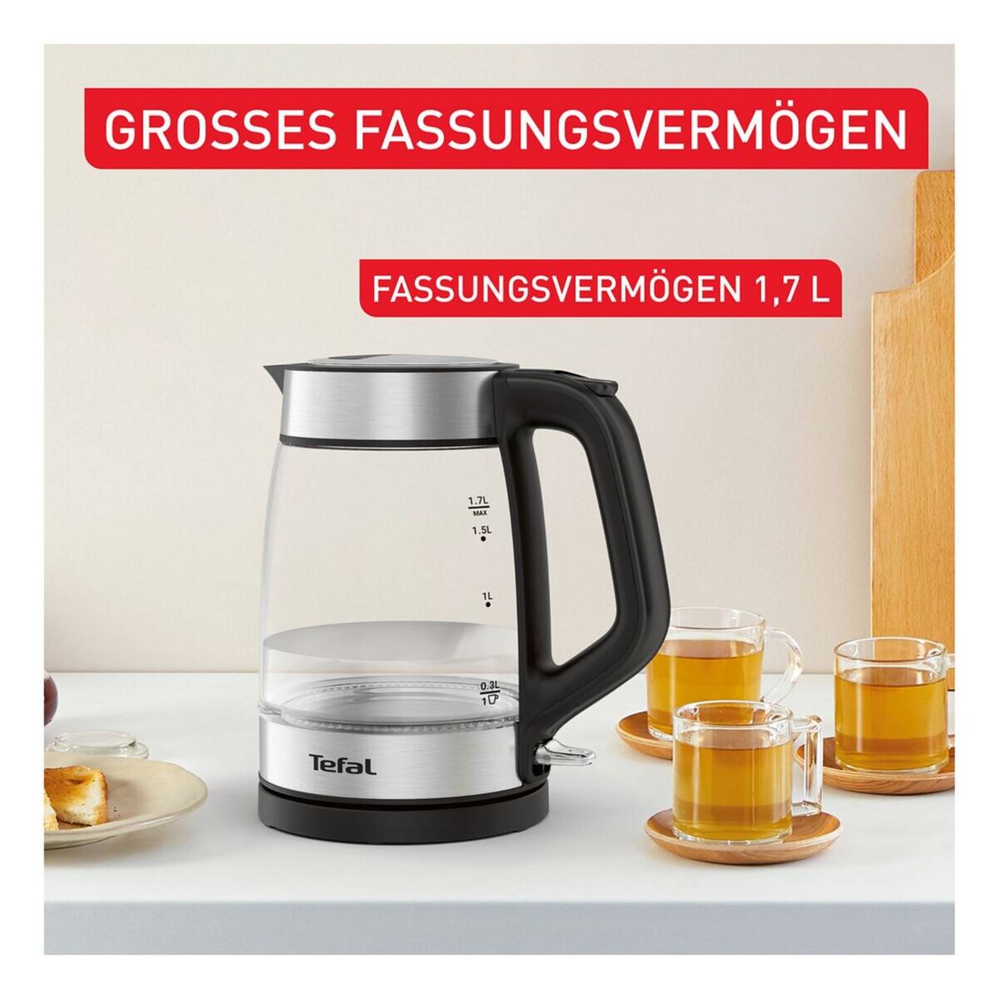 Der Tefal Glas-Wasserkocher kombiniert modernes Design mit leistungsstarker Technik für den täglichen Einsatz in der Küche. Dank seines großzügigen Fassungsvermögens von 1,7 Litern eignet er sich ideal für Familien, Gäste oder mehrere Tassen Tee und Kaffee. Das transparente Glasgehäuse mit blauer Beleuchtung sorgt dabei für eine stilvolle Optik während des Kochvorgangs.