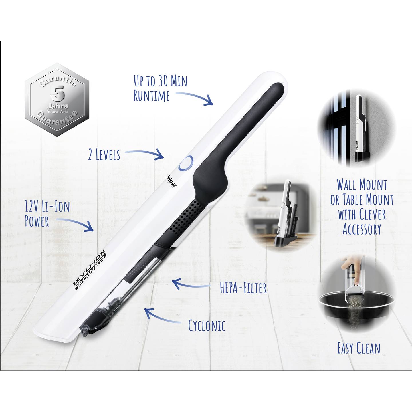 Der Trisa Akku-Handstaubsauger ist ein praktischer Helfer für die schnelle Reinigung zwischendurch. Dank leistungsstarkem 12‑V-Lithium-Ionen-Akku und beutelloser Technologie eignet er sich ideal für Haushalt, Auto oder Büro. Sein schlankes Design und die starke Saugleistung sorgen für effiziente Sauberkeit selbst an schwer erreichbaren Stellen.